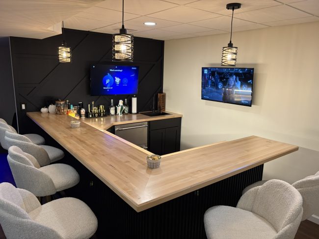 A Custom Maple Butcher Block Bar Top Duane is a custom cabinetmaker/woodworker near Lancaster PA. He fabricated these custom Maple Butcher Block bar tops starting with various sized slabs. It required plywood strip templates to insure a proper fit. The homeowner insisted that he inlay his medallion and sign his work. His website is www.dswoodshed.com
